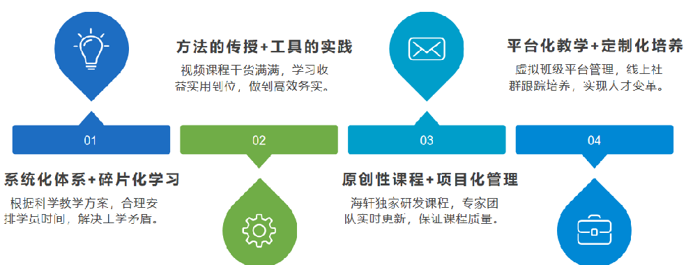 海轩一直致力于线上线下相结合的人才培养模式的探索和研究,我们依托线上平台,促使培训效果更加落地,海轩在课程内容及教学方法设置进行了重点的升级和打造,研发出“三线模式与三化课堂”模式,即线上学习:理论系统化、线下练习:训练场景化、线上复习:总结成果化。