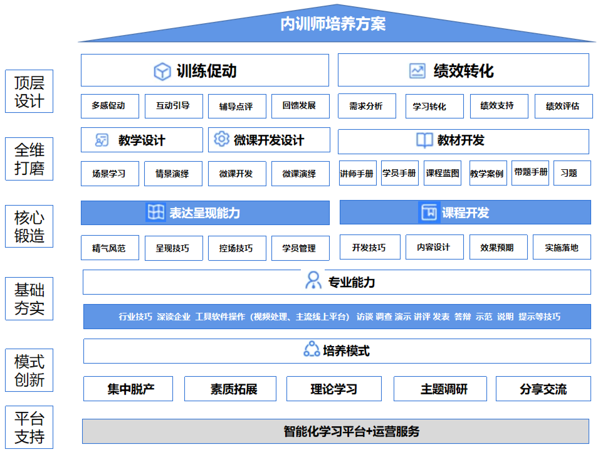 海轩根据贵公司实际需求,依托海轩云课堂“平台科技—内容研发—顾问服务”三重优势,从基础课程开发,内训师演绎训练,到教学设计、教材打磨、线上课程开发与应用,实现企业内训师体系搭建,支持企业绩效改进。