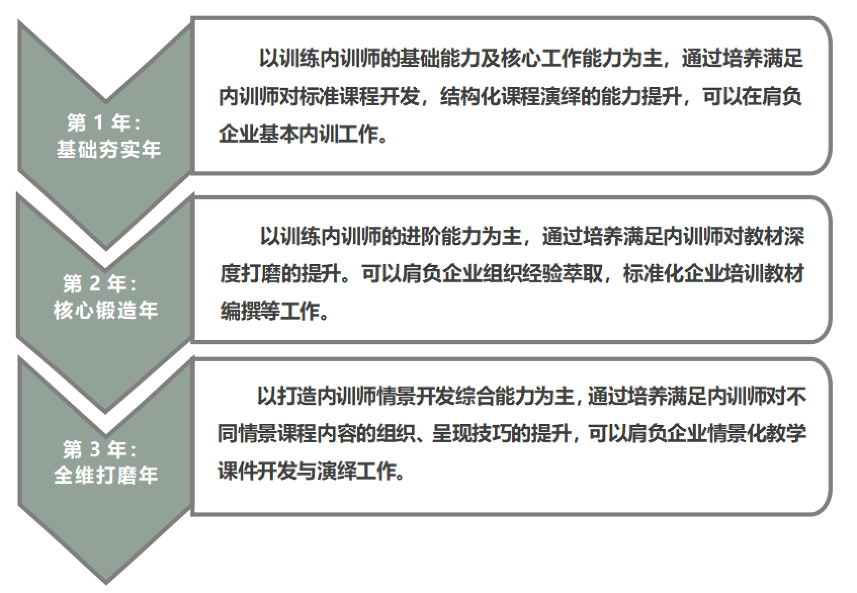 按照新时代国家及企业对青年内训师的总体要求,规划以“支撑公司战略,支持员工发展”为导向,依托公司对青年内训师的培养机制,通过系统化、周期性、递进式的培养,建立青年内训师培养体系,通过落实“一套培养标准模型、三年系统培养周期、打造一支卓越人才队伍”等重点措施,明确公司青年内训师的培养标准,促使华电上海培训中心青年内训师的快速成长成才,打造一支“年轻化、国际化、专业化”的综合型青年内训师队伍。